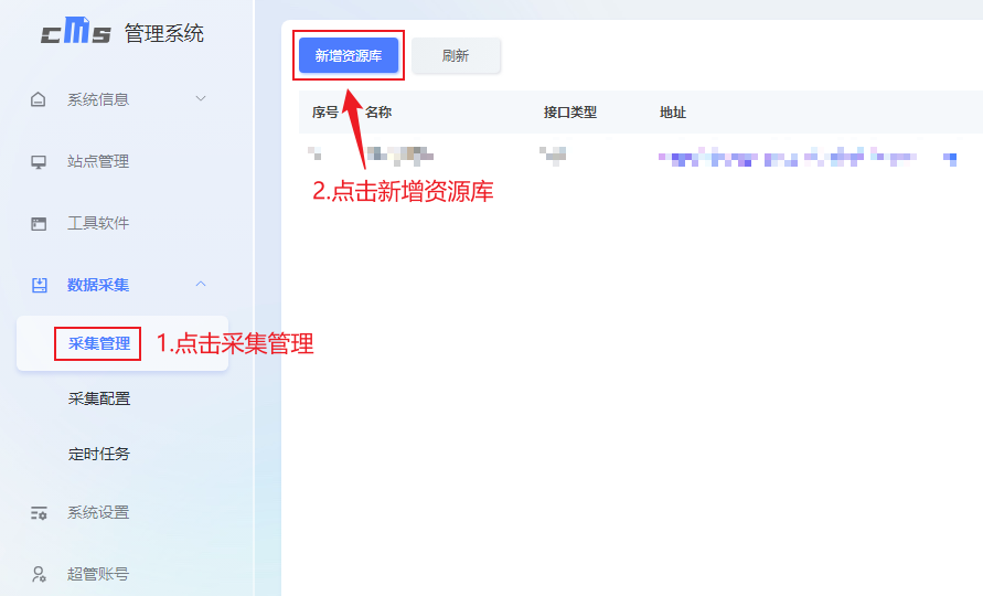 请按以下步骤进行:依次点击【采集】-【资源库管理】,然后依次输入
