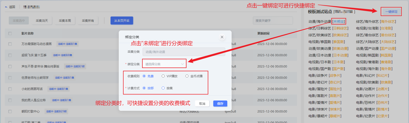 资源库添加成功后,接下来进行分类绑定,未绑定的分类数据将不能采集成功。